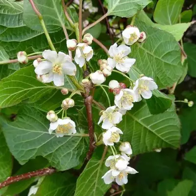 Цветки актинидии Прывабны имеют блюдцевидную форму, их белоснежные лепестки раскрываются в группах по 2-3 цветка, формируя симпатичные соцветия. Каждый цветок достигает диаметра около 2 см.