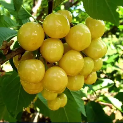 Саженцы черешни Приусадебная желтая отличаются большими округлыми плодами, размер которых составляет 20 мм в высоту и 21 мм в диаметре, а вес каждого плода достигает 5,5 граммов. Окраска плодов ярко-желтая, без подкожных точек, что придает им дополнительную привлекательность. Мякоть желтая, сочная и хрящеватая, обладает уникальным кисло-сладким вкусом, а цвет сока – бесцветный. Плоды обладают хорошей отделяемостью косточки от мякоти и отличным отрывом, что делает их удобными для сборки и употребления.
