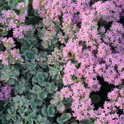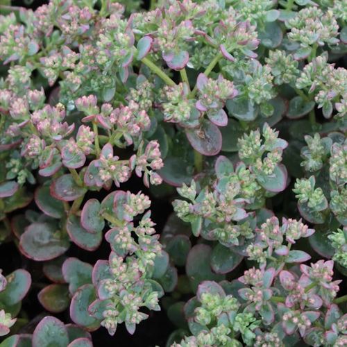 Цветение начинается в августе и длится до сентября: над ковром листвы поднимаются соцветия с пыльно-розовыми цветками, создавая контраст и усиливая визуальную глубину композиции. Растение невысокое — около 12–15 см, идеально подходит для оформления альпинариев, рокариев, бордюров, зеленых крыш. Смотрится органично как в групповых посадках, так и в соло-композициях.